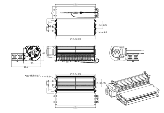 風(fēng)輪尺寸:60*202.5mm,60是風(fēng)輪直徑,葉片長(zhǎng)度是202.5mm,單相罩極異步電機(jī),電壓120V /60Hz或220-240V/50Hz,額定轉(zhuǎn)速1000-1800rpm,風(fēng)速2.0-3.5M/S,